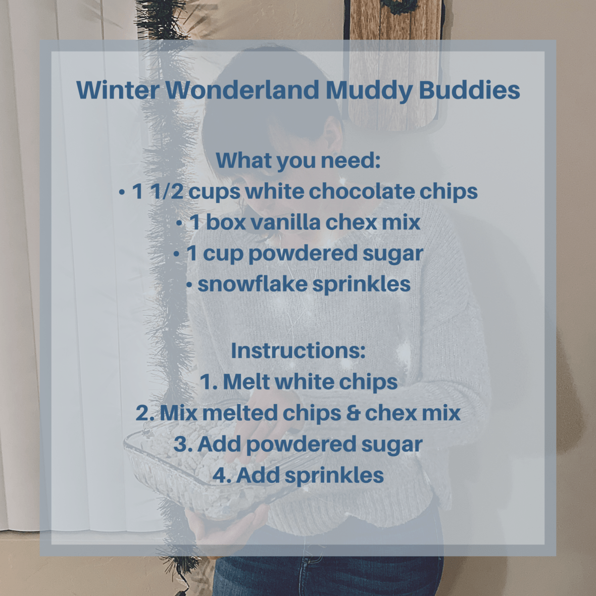I recently made a yummy treat called Winter Wonder Muddy Buddies. It’s a simple recipe and perfect for parties or gifting holiday treats. I’ve attached the recipe here if you’re looking for something simple with a winter wonderland theme!